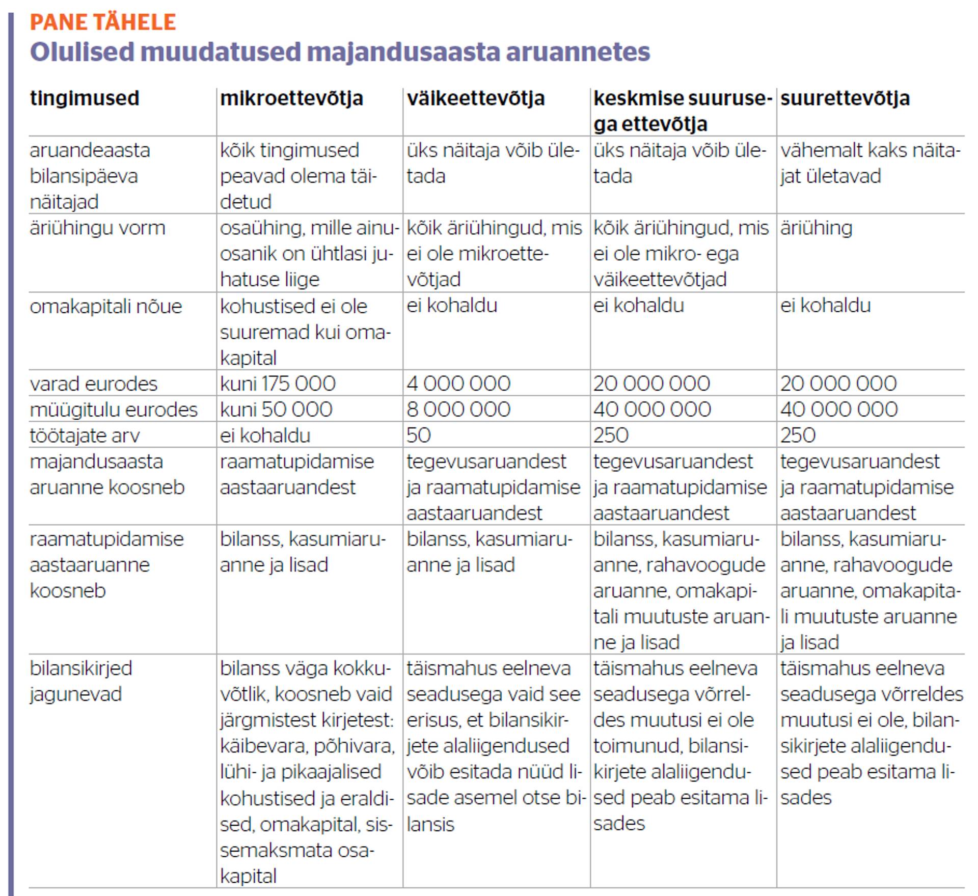 2016. aasta jaanuarist ja hiljem alanud majandusaasta aruannetele kehtivad raamatupidamise seaduse järgi mõnevõrra teistsugused nõuded eri liiki ettevõtjatele. Eriti tähelepanelik tasub olla mikro- ja väikeettevõtjatel.